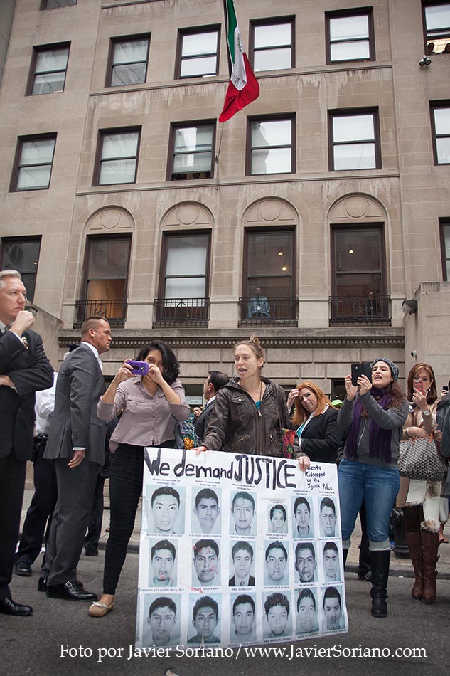 - Miércoles 5 de noviembre de 2014 - Manhattan, ciudad de Nueva York - Manifestantes frente al Consulado General de México en la ciudad de Nueva York en solidaridad con los 43 estudiantes de Ayotzinapa, Guerrero, México. Foto por Javier Soriano/www.JavierSoriano.com