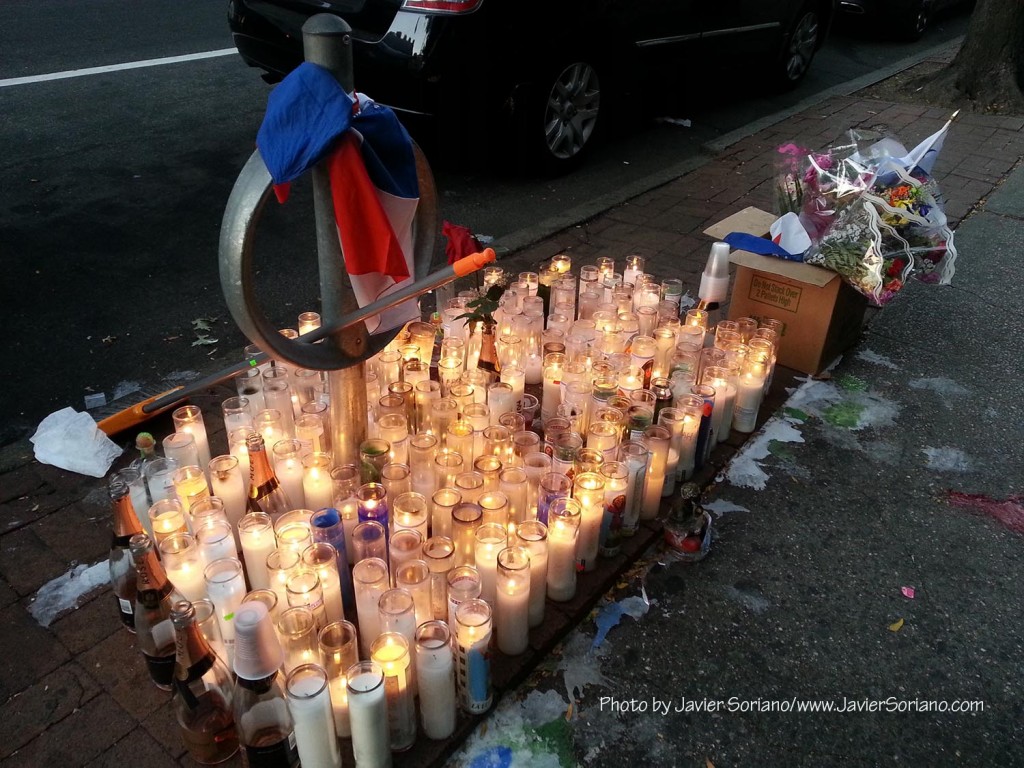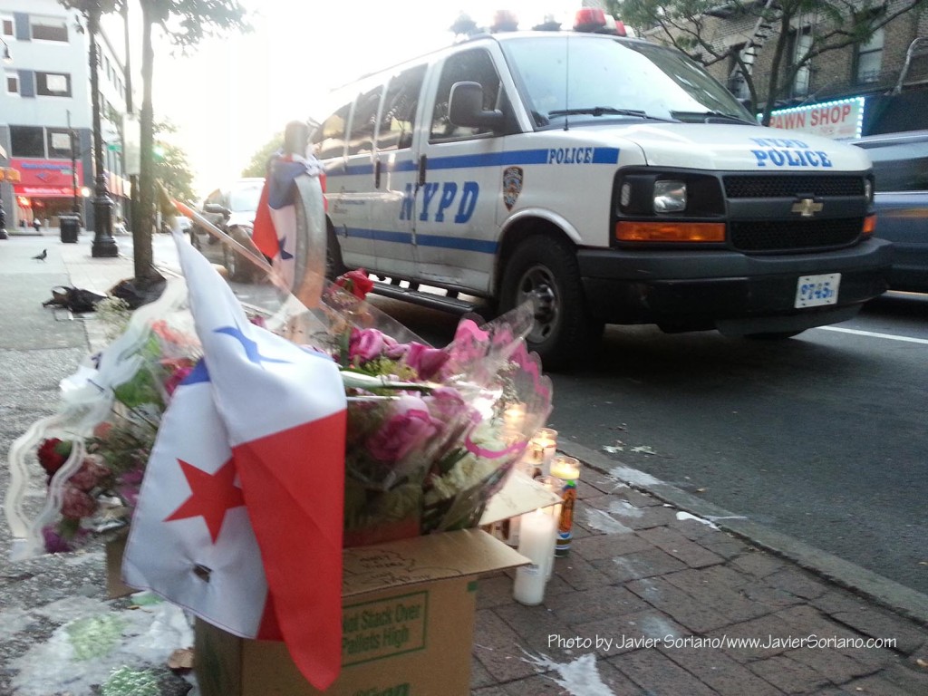 - 9/23/2015, Flatbush, NYC - Candles for a Black/Latino man killed on 9/19/2015. (I think, NYPD officers are here 24/7.) Photo by Javier Soriano/http://www.JavierSoriano.com/