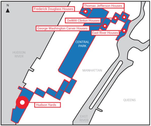 Los registros obtenidos por CityLab bajo la Ley de Libertad de Información revelan el mapa manipulado que Empire State usó para calificar a Hudson Yards para el financiamiento EB-5. Esta área de empleo dirigida o TEA en particular surge del West Side e incluye Central Park. (Piense en eso: un mapa de Manhattan que afirma que Central Park es un área con problemas económicos). Más allá del parque, la zona de calificación para Hudson Yards captura varias secciones censales en Harlem, donde los proyectos de vivienda pública aumentan la cifra general de desempleo.
